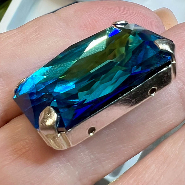 A small note about foil-backed stones: Swarovski’s sew-ons are excellent quality; I have at least three crystal rings I rarely take off. However, some chemicals, oils, and lotions can eat away at the foil on the back of the crystal. If in doubt, whether something will hurt the foil, take the ring (or other piece of jewelry off).