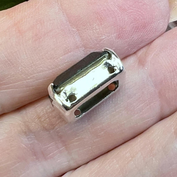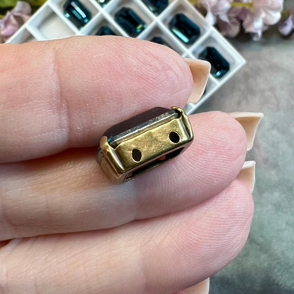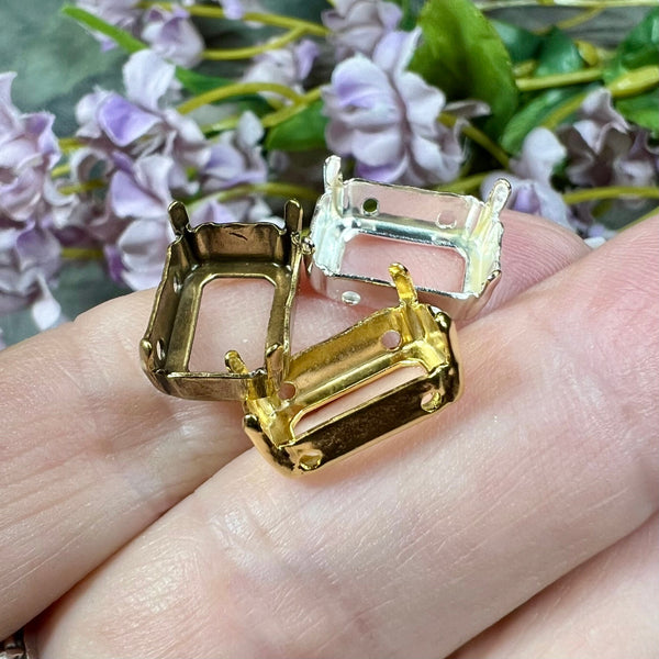 Swarovski Sew-on 14x10mm Emerald Octagon. These Swarovski crystal stones are set in a high-quality 4-pronged, open-back setting. Settings are available in shiny silver-plated, gold-plated, and antique bronze/brass-plated finishes.