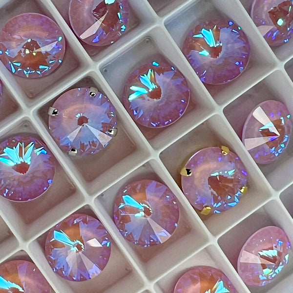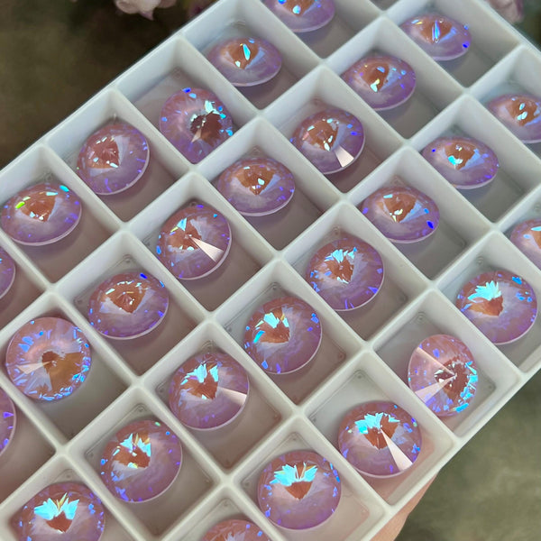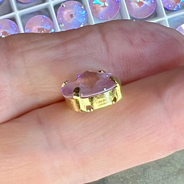 Swarovski Crystal 12mm 1122 Rivoli in Lavender DeLite. These Swarovski crystal stones are set in a high-quality 4-pronged, open-back, silver or gold-plated setting (your choice). The listing price is for two pieces with settings.