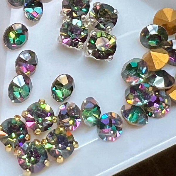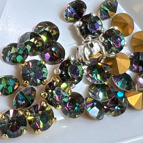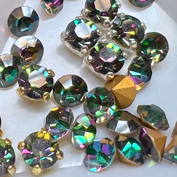 Rare Vitrail Dark 24ss/5.4mm Vintage Swarovski - 4 Pieces Crystal, with Settings. The listing price is for four pieces with settings. The high-quality 4-pronged, open-back settings have four holes, one hole on each side. Settings available in silver or gold-plated - your choice.