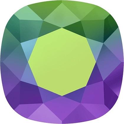 Swarovski color Scarabaeus Green is an iridescent, metallic coating that shimmers with shifting tones of green, blue, and purple. The complex hue is a combination of bright and shadowy facets, giving the crystal a graphic and striking appearance.