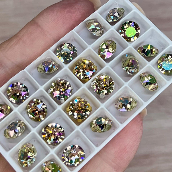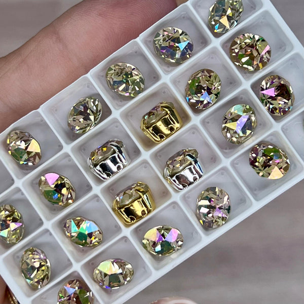 The Xirus Chaton was created to emulate the diamond cut. They have more facets and more sparkle!! These are gorgeous, featuring clear or silk Swarovski crystals with a custom coating in a light AB finish, which includes flashes of pink, green, and blue, making them sparkle and shimmer.