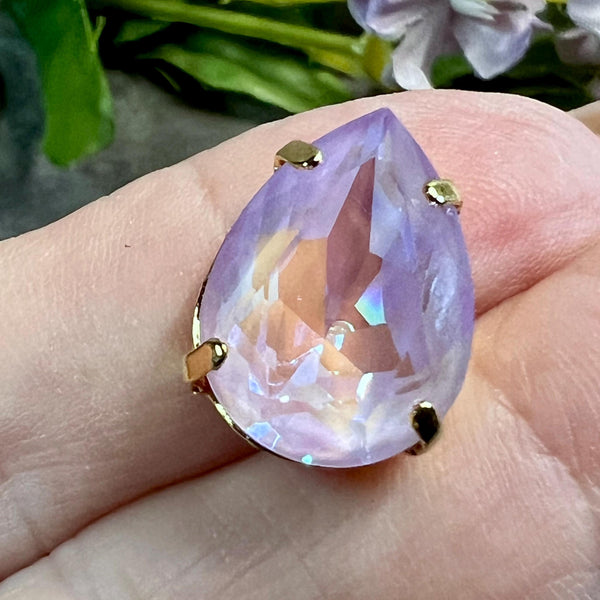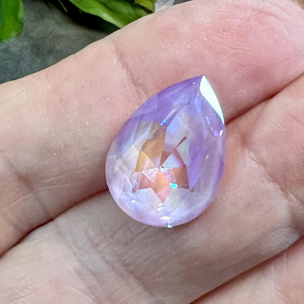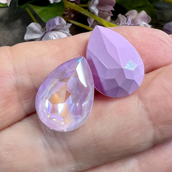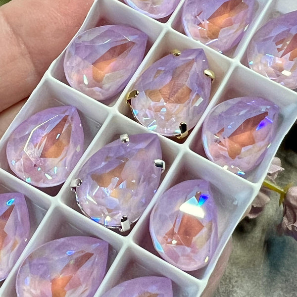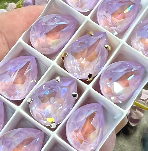 Crystal Lavender DeLite, 14x10mm or 18x13mm pear shape article 4320. These Swarovski crystal stones are set in a high-quality 4-pronged, open-back, silver or gold-plated setting, your choice. The listing price is for EACH crystal, with or without a setting. Please note!! There are no holes in the crystal - the only holes are in the setting.