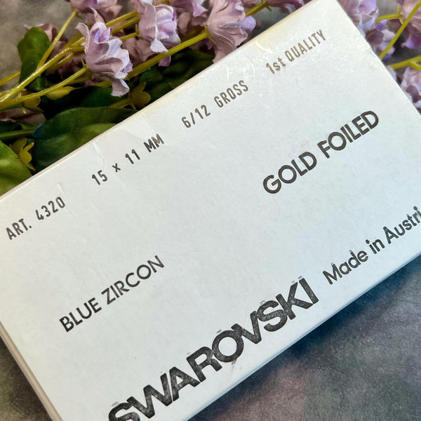 Swarovski Blue Zircon is a vibrant shade of blue with a touch of green in its undertones, reminiscent of the stunning blue waters of the Caribbean. It is often associated with the December birthstone. While blue zircon exists in nature as a gemstone, Swarovski's version is a precisely cut crystal that captures the color and brilliance of the natural stone. They have faceted tops and gold-foiled backs in excellent condition.