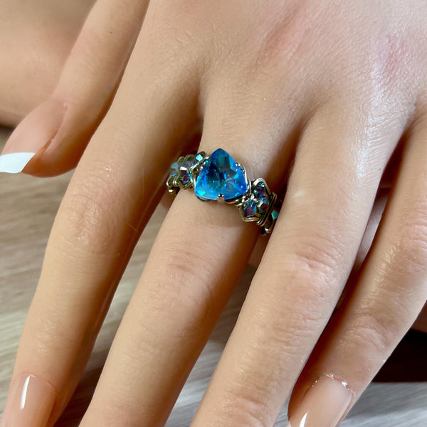 This entirely handmade ring features a unique, Genuine Swarovski Crystal in Ocean DeLite, a vibrant, medium aquamarine or light sapphire blue with greenish undertones, creating a refreshing, deep, and crisp appearance reminiscent of the ocean. It is a Laquer Pro effect color from the Spring/Summer 2020 line, known for its intense blue flashes and sparkling splendor.