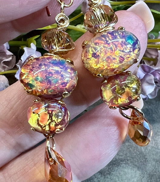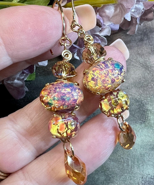 Pink, Red, and Gold, Opal Dangle Earring, Vintage Swarovski Crystal handmade Earrings, made to order in Sterling Silver or 14K GF, (shown in 14K GF)