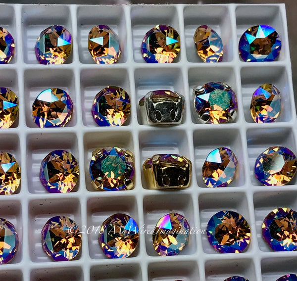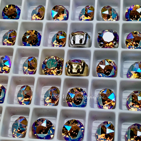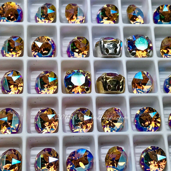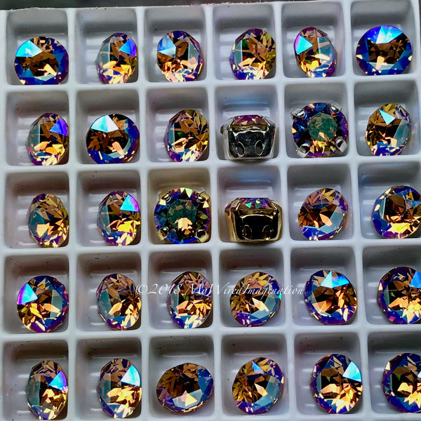 These Swarovski crystal stones are set in a high-quality 4-pronged, open-back, 4-hole, two-on-2-sides, sew-on setting. These holes are very tiny, 1mm(?), but can easily be enlarged with an awl or large needle. (Settings with one hole on all four sides available on request.)