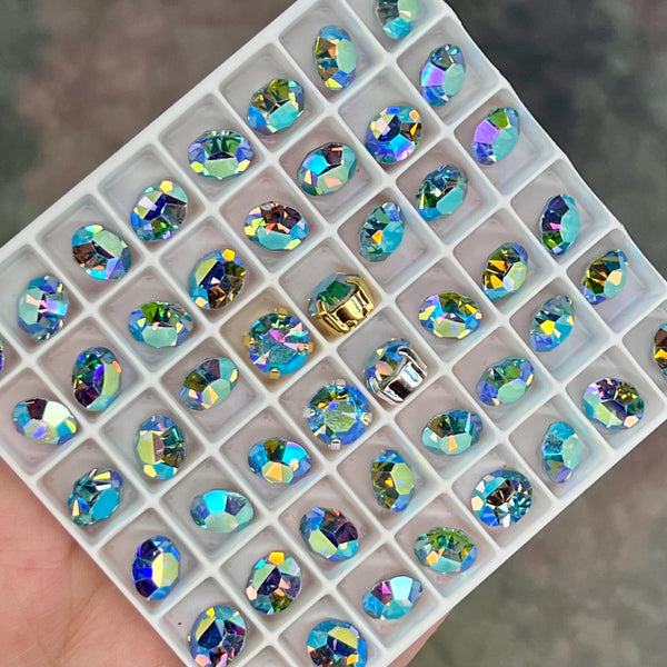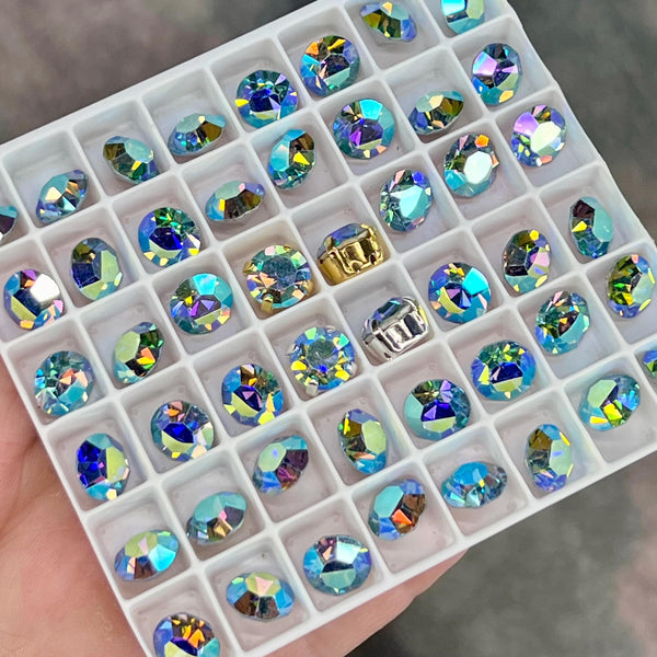 Aquamarine AB 40ss Swarovski Vintage Crystal, 2 Pcs with SP or GP Setting, Ocean Blue AB. These Swarovski crystal stones are set in jewelry-quality, four-pronged, open back settings, either silver or gold-plated - your choice.