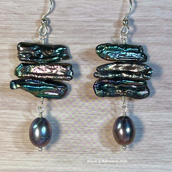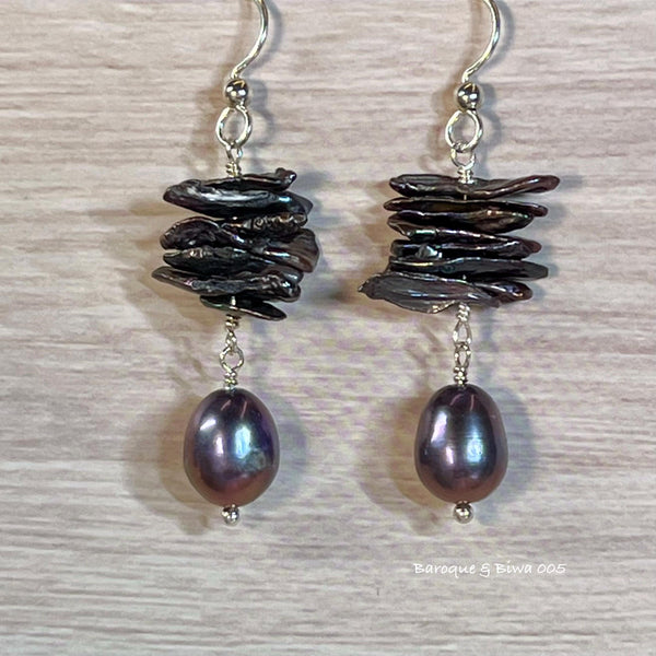 B/B Biwa & Baroque 005 - 2" long; 1/2" wide at the widest point. Beautiful and stylish, dark metallic purple with pink & green shimmer, and matching baroque pearl drops.