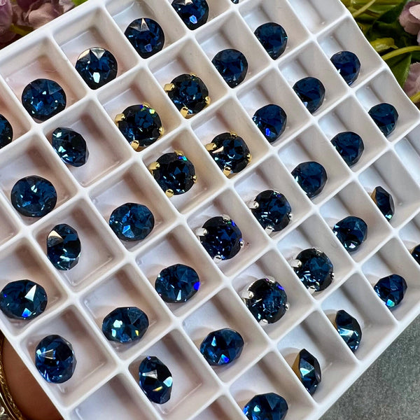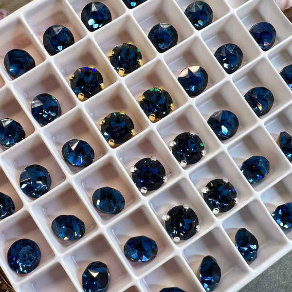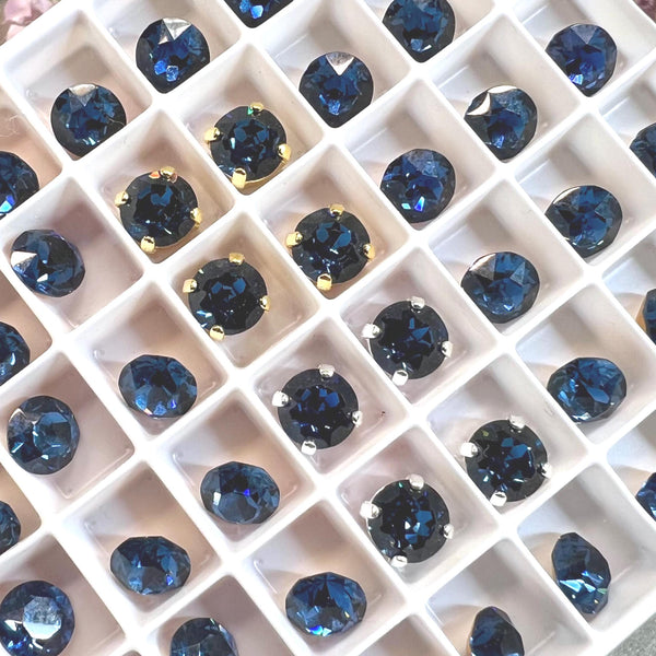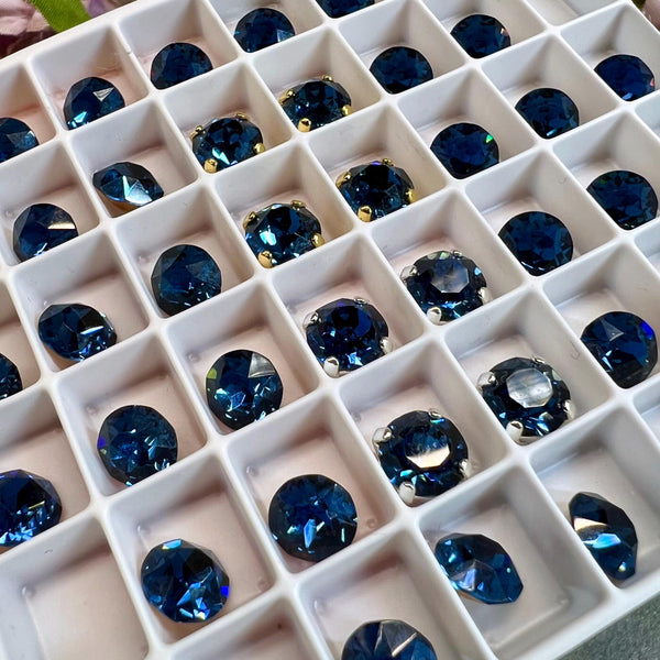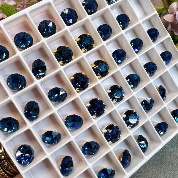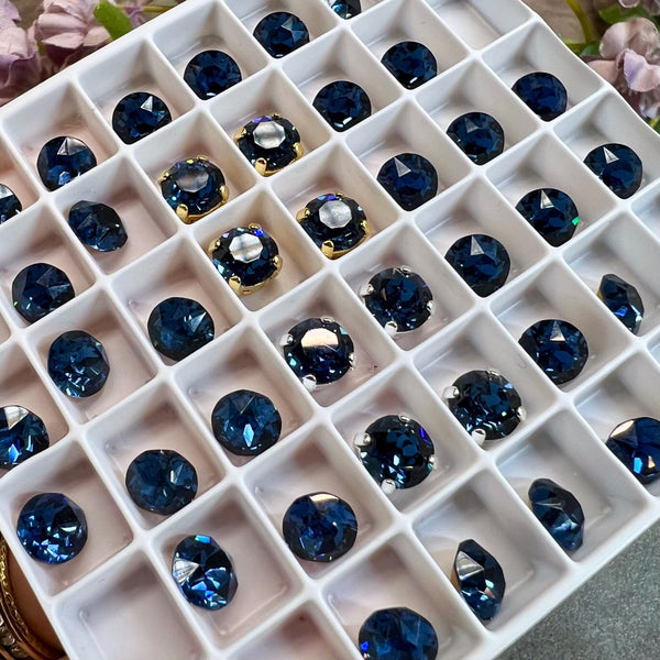 Montana Sapphire 30ss-6mm Dentelle Vintage Swarovski Crystal, Dark Ocean Blue with SP or GP Settings. The listing price is for four pieces with settings. The high-quality 4-pronged, open-back settings have four holes, one hole on each side. Settings available in silver or gold-plated - your choice.
