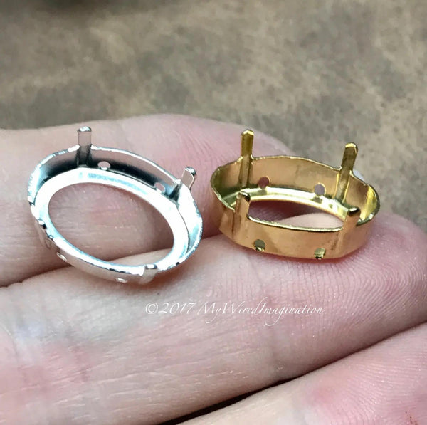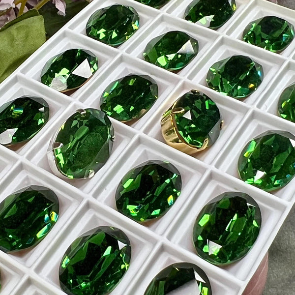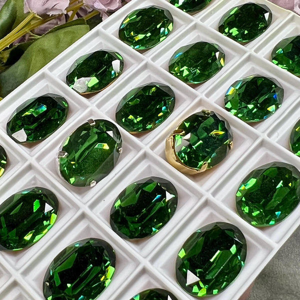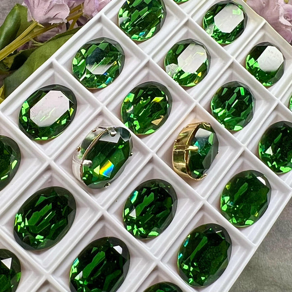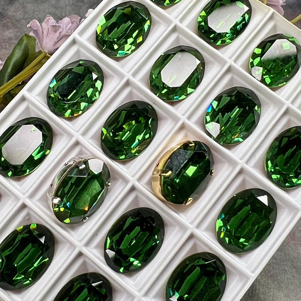 Vintage Swarovski, 18x13mm 4120 oval Tourmaline. These Swarovski crystal stones are set in a jewelry quality four pronged, open back settings. Your choice of silver plated, gold plated, or just the crystal. Now available in 1, 2 or 4 pieces with or without setting. Two pieces have a 10% discount; four pieces have a 15% discount.