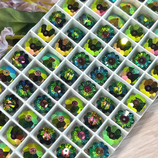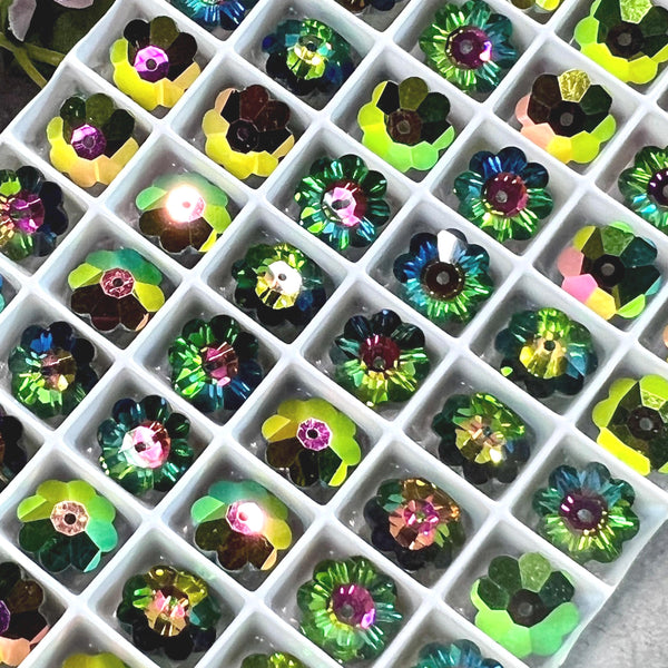 Swarovski's Vitrail Medium color is a vibrant, dynamic effect characterized by a combination of colors that shift and shimmer with light and viewing angle. It features a base of deep, saturated green with reflective hues of pink, purple, orange, and yellow. This creates a kaleidoscope-like effect, making the crystal appear to change colors as it moves. Vitrail Medium is a popular and well-regarded color for Swarovski crystals, thanks to its striking visual appeal.