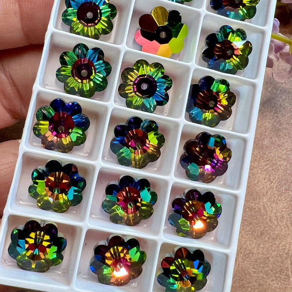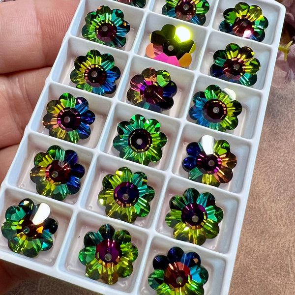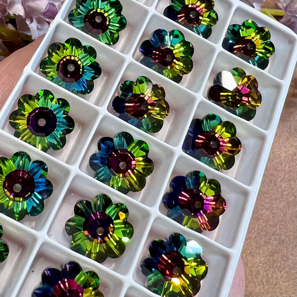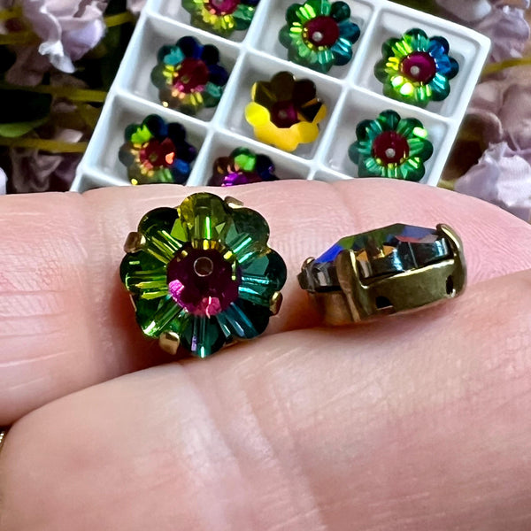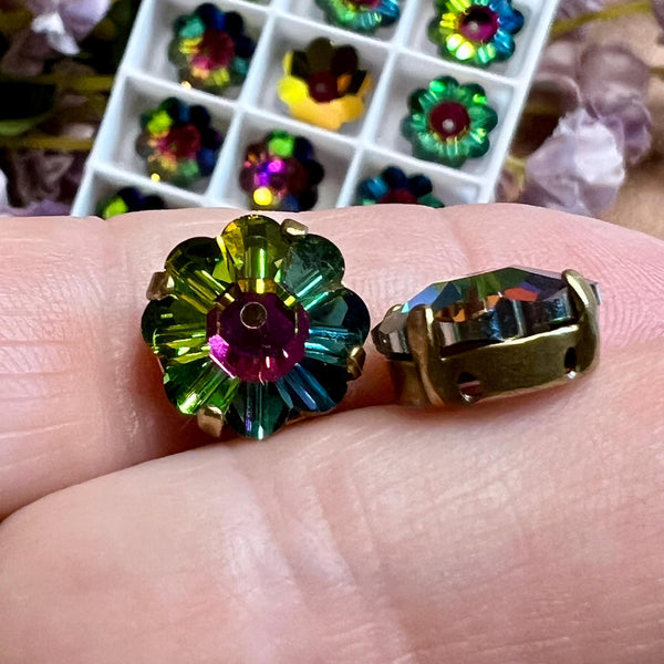 Vitrail Medium 12mm Vintage Swarovski Margarita With or Without a Setting. Yes, you read that correctly - margarita beads with or without settings. I absolutely love margarita beads; the vibrant color, the flower shape. The problem is, they are primarily used as spacers on their 'side'. That's not a 'bad' thing, it just seems a waste of so much sparkly goodness. But put them in a sew-on type setting, and you expand their design possibilities tenfold. Listing price is for 2 pieces, with or without settings.